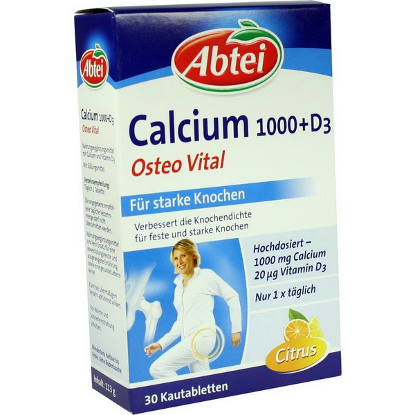 Abtei Calcium 1000 + D3 Osteo Vital kombiniert hochdosiertes Calcium mit dem Calcium-Einbauhelfer Vitamin D3, das die Einlagerung von Calcium in die Knochen und Zähne und damit eine normale Knochendichte bis ins hohe Alter unterstützt.