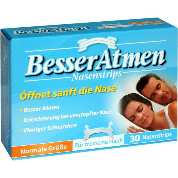 BesserAtmen Nasenstrips können sofortige Abhilfe bei Problemen mit der Nasenatmung schaffen, sie wirken rein mechanisch und sind daher frei von arzneilichen Wirkstoffen. BesserAtmen Nasenstrips öffnen sanft die Nase. Damit erleichtern sie die Nasenatmung z. B. bei Erkältungen oder Allergien und können so das Schnarchen reduzieren.