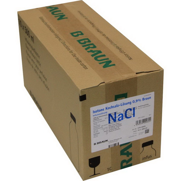 Isotone Kochsalz-Lösung 0,9% B. Braun ist eine Kochsalzlösung, die über einen Venentropf zugeführt wird. Die Lösung enthält Kochsalz in einer Konzentration, die der Salzkonzentration im Blut entspricht. Sie wird angewendet zum Ersatz von Flüssigkeiten und Salz bei: