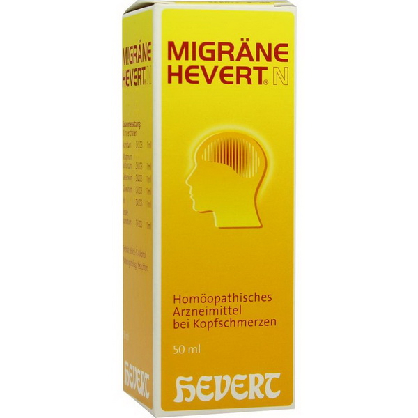 Migräne Hevert N Tropfen enthalten zur Beseitigung gefäßbedingterKopfschmerzen spezifisch wirksame homöopathische Bestandteile inausgewogenem Verhältnis. Die menschlichen Gefäße, besonders die desGehirns, reagieren auf psychische oder körperliche Überlastung oft mitSchmerzen. Diese können durch abnorme Veränderungen des Durchmessersvon Versorgungsgefäßen verursacht sein. Die Gefäße verengen sichzunächst und erweitern sich später über das normale Maß hinaus.